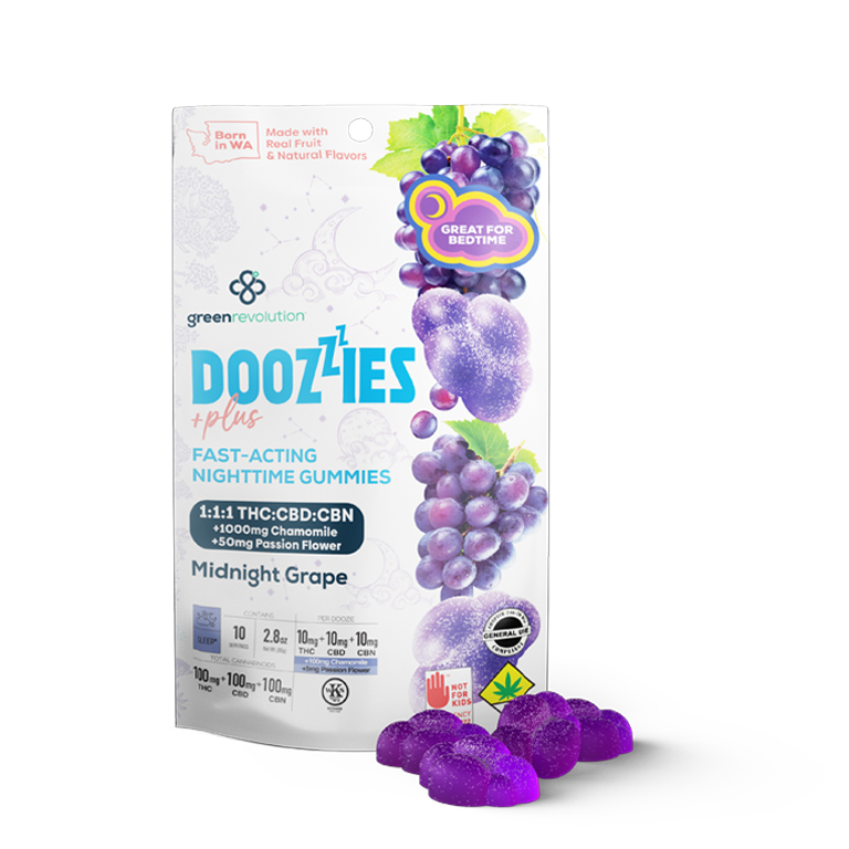 Sleep deeper with Doozies + Plus Midnight Grape. This fast-acting nighttime gummy combines 100mg THC, 100mg CBD, and 100mg CBN per bag in a balanced 1:1:1 ratio, plus 1000mg chamomile and 50mg passion flower for enhanced relaxation. Whether you’re winding down or battling restless nights, this flavorful blend is your perfect bedtime companion.